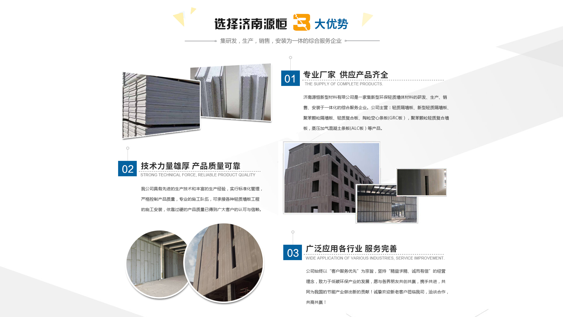 濟南源恒新型材料有限公司坐落于美麗的泉城濟南,是集新型環(huán)保輕質(zhì)墻體材料的研發(fā)、生產(chǎn)、銷售、安裝于一體化的綜合服務企業(yè)。我公司具有的生產(chǎn)技術和豐富的生產(chǎn)經(jīng)驗,為您提供輕質(zhì)隔墻板、新型輕質(zhì)隔墻板、聚苯顆粒隔墻板、輕質(zhì)復合板、陶粒空心條板(GRC板),聚苯顆粒輕質(zhì)復合墻板,蒸壓加氣混凝土條板(ALC板)等產(chǎn)品,本公司有專的施工隊伍,可承接各種輕質(zhì)墻板工程的施工安裝。輕質(zhì)隔墻板是國家推廣使用的新型輕質(zhì)、綠色無害建材,是墻改節(jié)能政策大力扶持的環(huán)保節(jié)能產(chǎn)品,是發(fā)達國家普遍采用的新型墻體材料。濟南源恒新型材料有限公司實行標準化管理,嚴格控制產(chǎn)品質(zhì)量,依靠過硬的產(chǎn)品質(zhì)量已得到廣大客戶的認可與信賴。公司產(chǎn)品遍布各大城市,與國內(nèi)多家客戶建立了良好的合作關系。公司始終以“客戶服務優(yōu)先”為宗旨,堅持“精益求精、誠而有信”的經(jīng)營理念,致力于低碳環(huán)保產(chǎn)業(yè)的發(fā)展,愿與各界朋友共創(chuàng)共贏,攜手共進,共同為我國的節(jié)能產(chǎn)業(yè)做出新的...